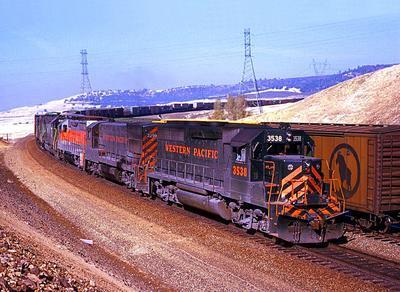 Western Pacific GP40 puzzle, based on an original photo by Joe Blackwell (photo copyright Joe Blackwell -- used with permission). Photographed at Oroville, California, November, 1973.