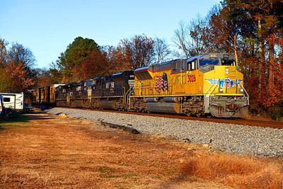 Union Pacific SD70AH-T4 puzzle, based on an original photo by Kerry Douglas (photo copyright Kerry Douglas -- used with permission). Photographed at New England, Georgia, October 29, 2022.