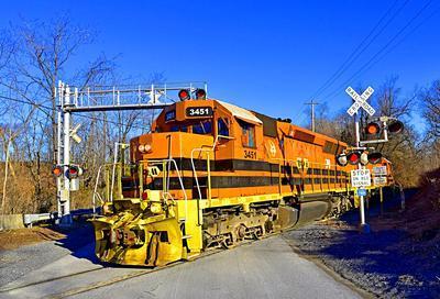 Maryland Midland Railway SD40-2 puzzle, based on an original photo by Ted Grumbine (photo copyright Ted Grumbine -- used with permission). Photographed at Woodsboro, Maryland, February 9, 2022.